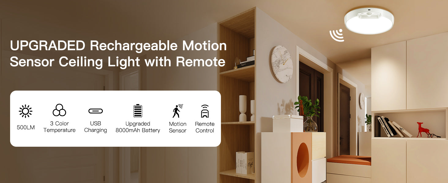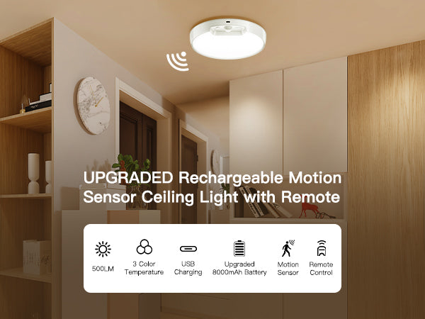- Newly Upgraded 8000mAh Rechargeable Battery – Unbeatable Runtime Say goodbye to frequent charging! Our ceiling light now features a massive 8000mAh rechargeable battery, one charge can last 12-15 hours in stay on mode and 30-60 days in motion sensor mode. (Depends on brightness and times of use) Even at full brightness, enjoy 15–20 hours of uninterrupted light, perfect for high-traffic areas or extended power outages