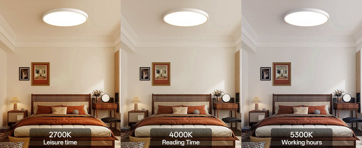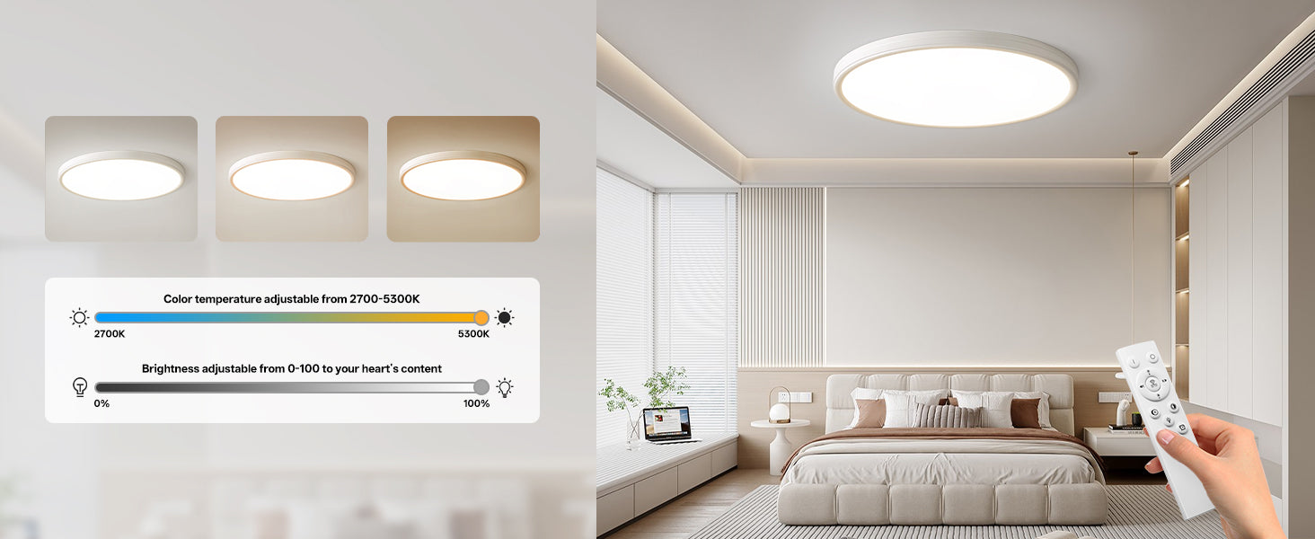 3.Brightness and color temperature adjustable:Remote-control dimmable ceiling light with adjustable color temperature 2700–5300K and 0–100% brightness—switch easily from warm bedtime glow to bright reading light.