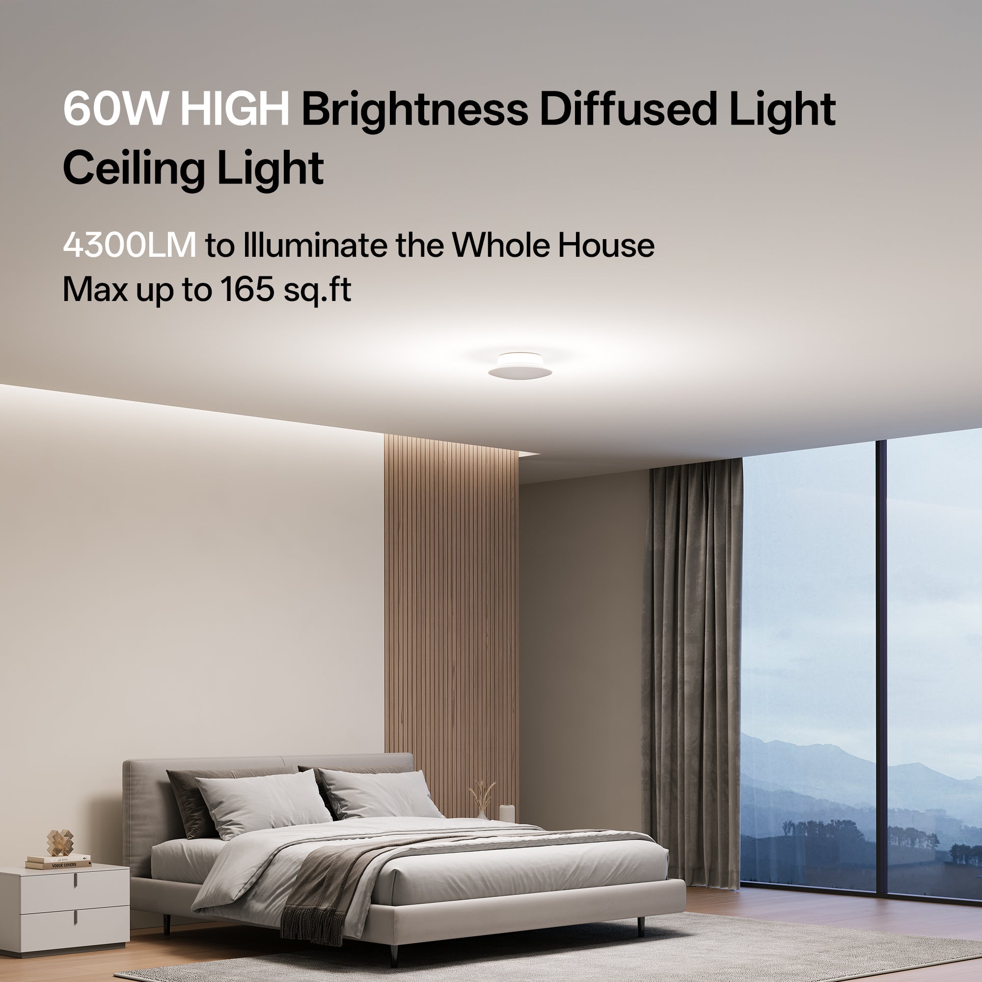 Despite its compact size, this flush mount ceiling light delivers up to 4300 lumens at 60W, providing enough brightness to comfortably light an entire small to medium-sized room without feeling harsh.