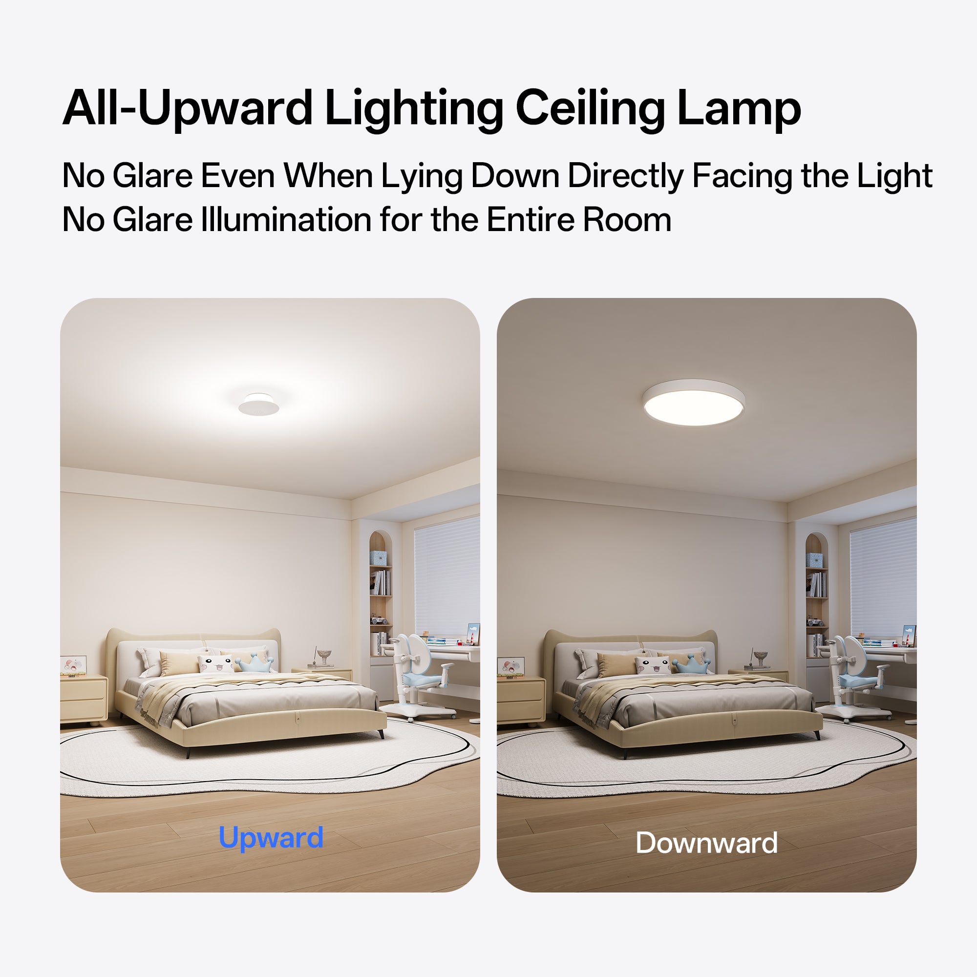 Yes. This ceiling light uses indirect upward lighting that reflects light off the ceiling instead of shining directly into your eyes. This design significantly reduces glare and creates soft, comfortable ambient lighting—even when viewed directly or while lying down.